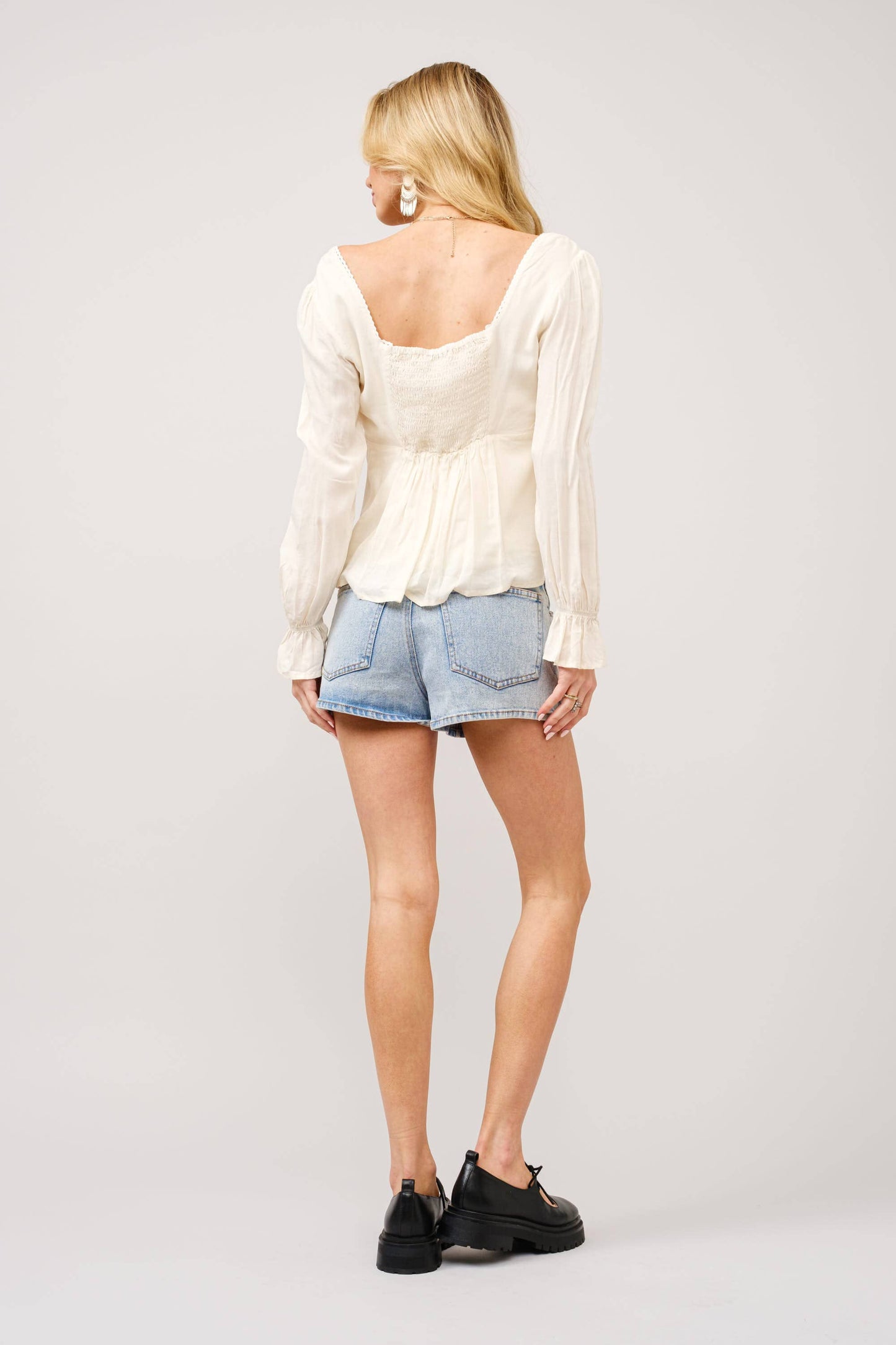 Garment-washed denim skort with a low mid-rise fit and a micro mini length, offering the style of a skirt with the comfort of shorts underneath.