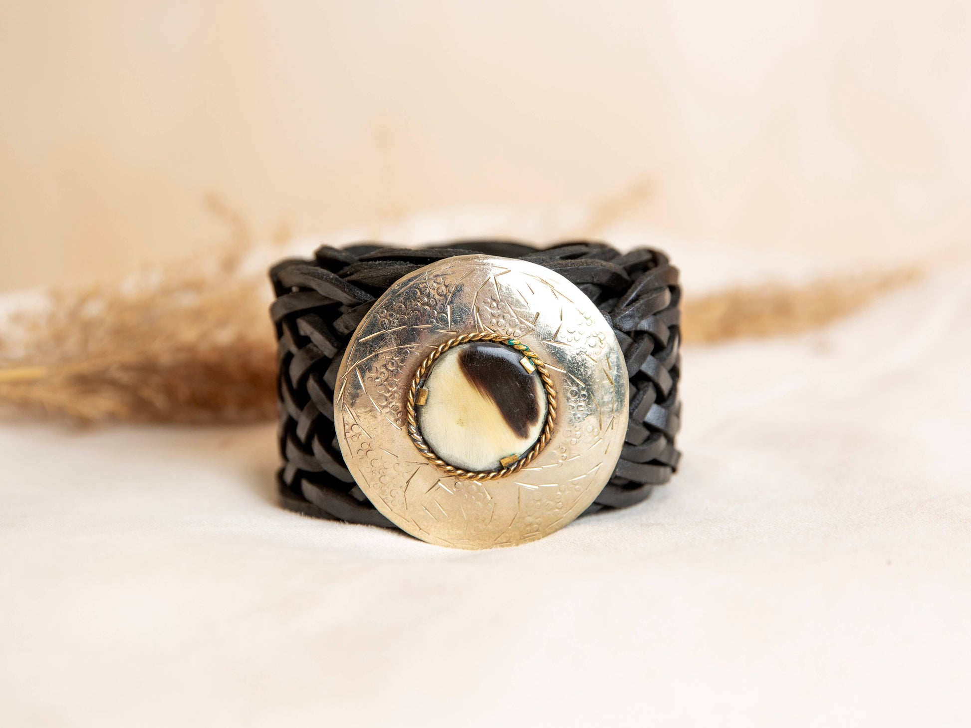 Su hebilla redonda de latón y piedra nacarada en dos tonalidades es el detalle ideal para combinar con cualquiera de tus looks más veraniegos y estilo boho.