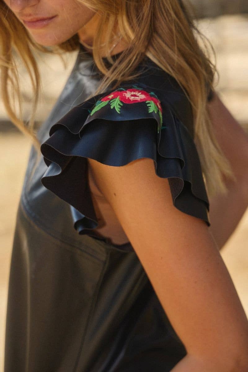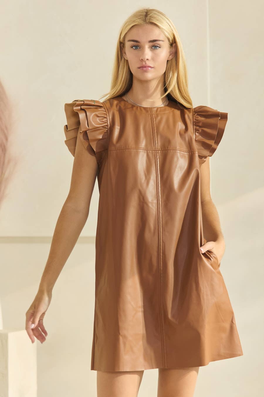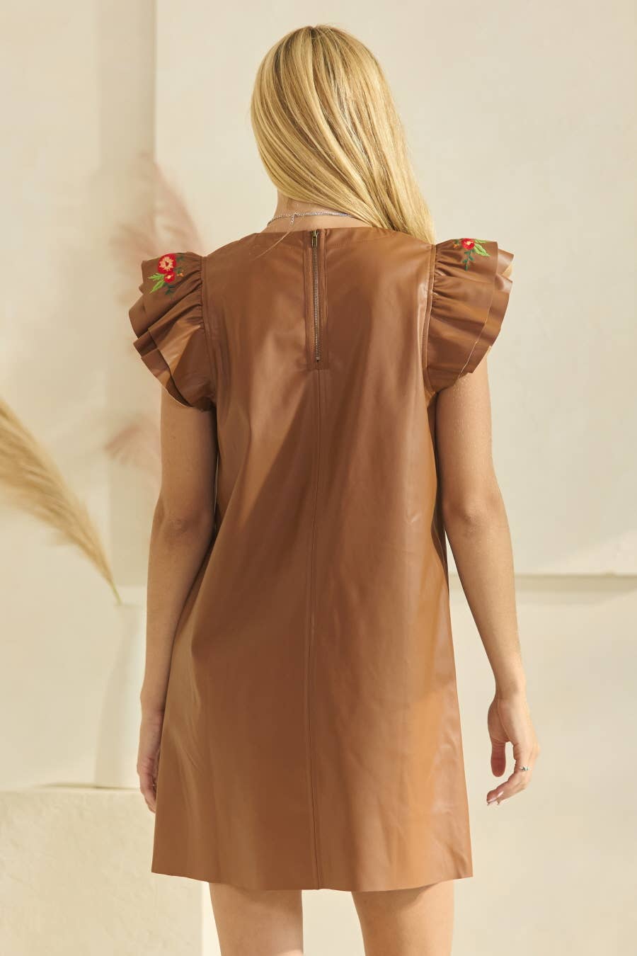 PU leather shift mini dress with embroidered flutter sleeve with back open zipper. Also available in sizes 1XL to 3XL: Style no. ID17115P. , Total Length: 35 1/2", Self: 55% Polyester, 45% PU, Lining: 100% Polyester.