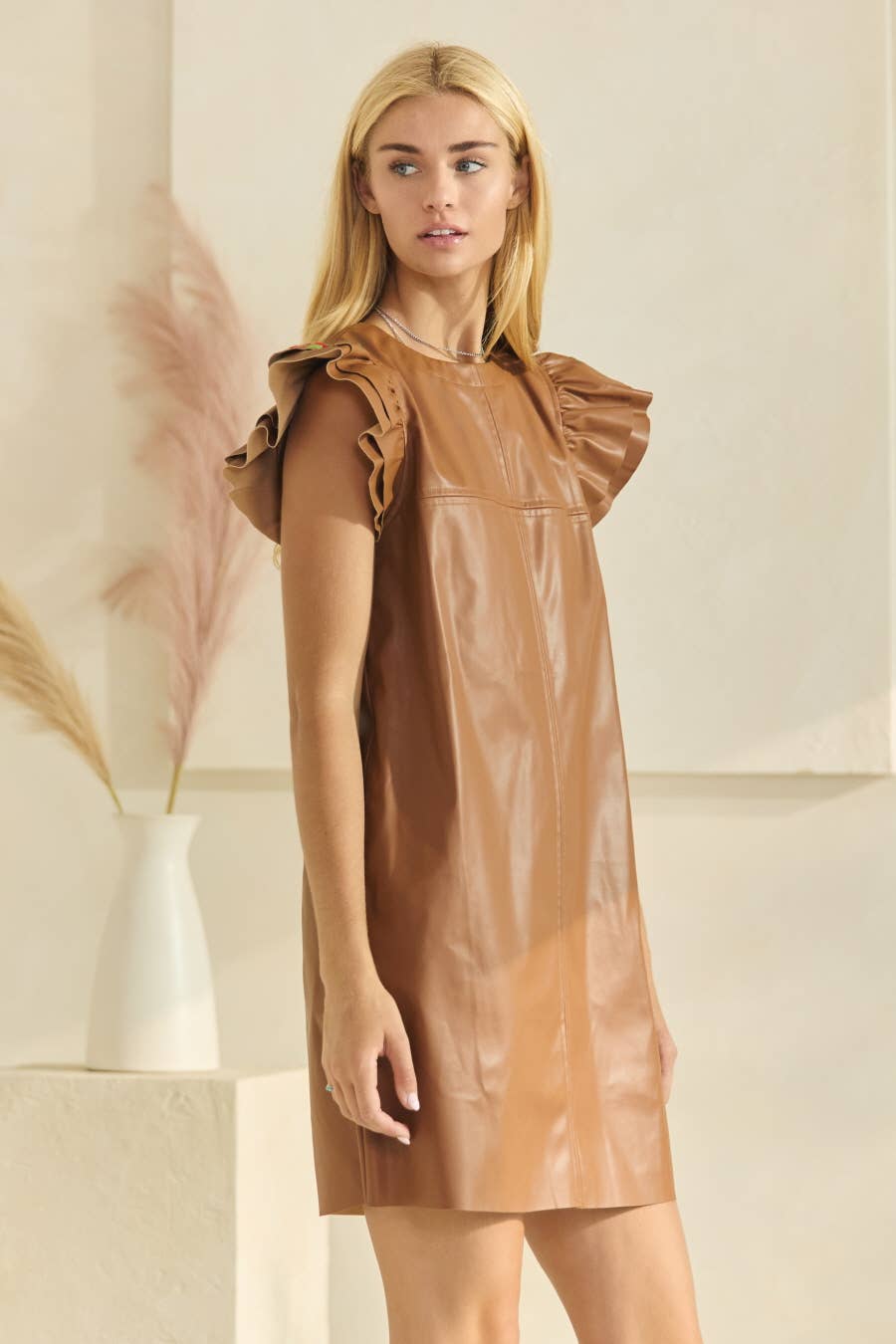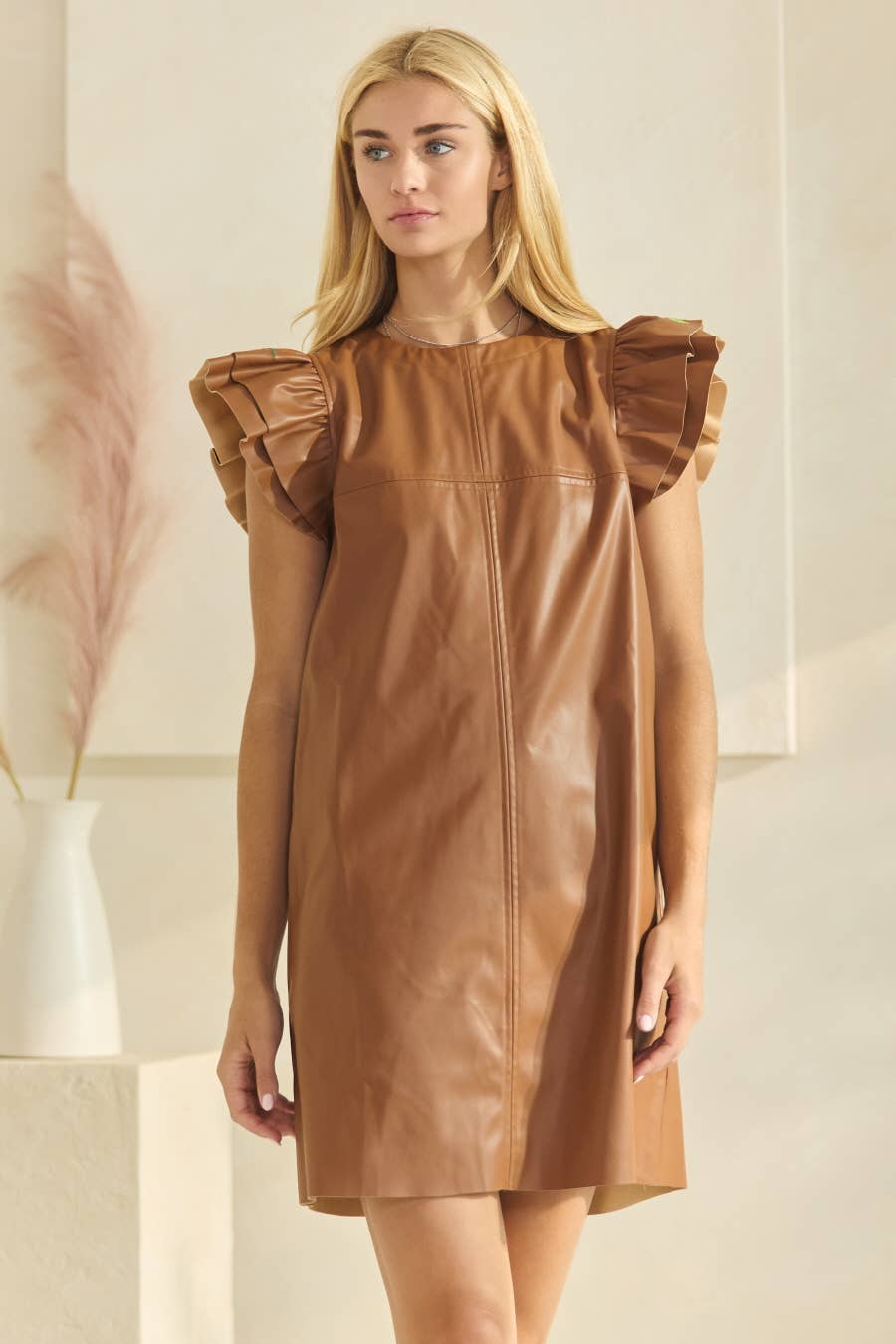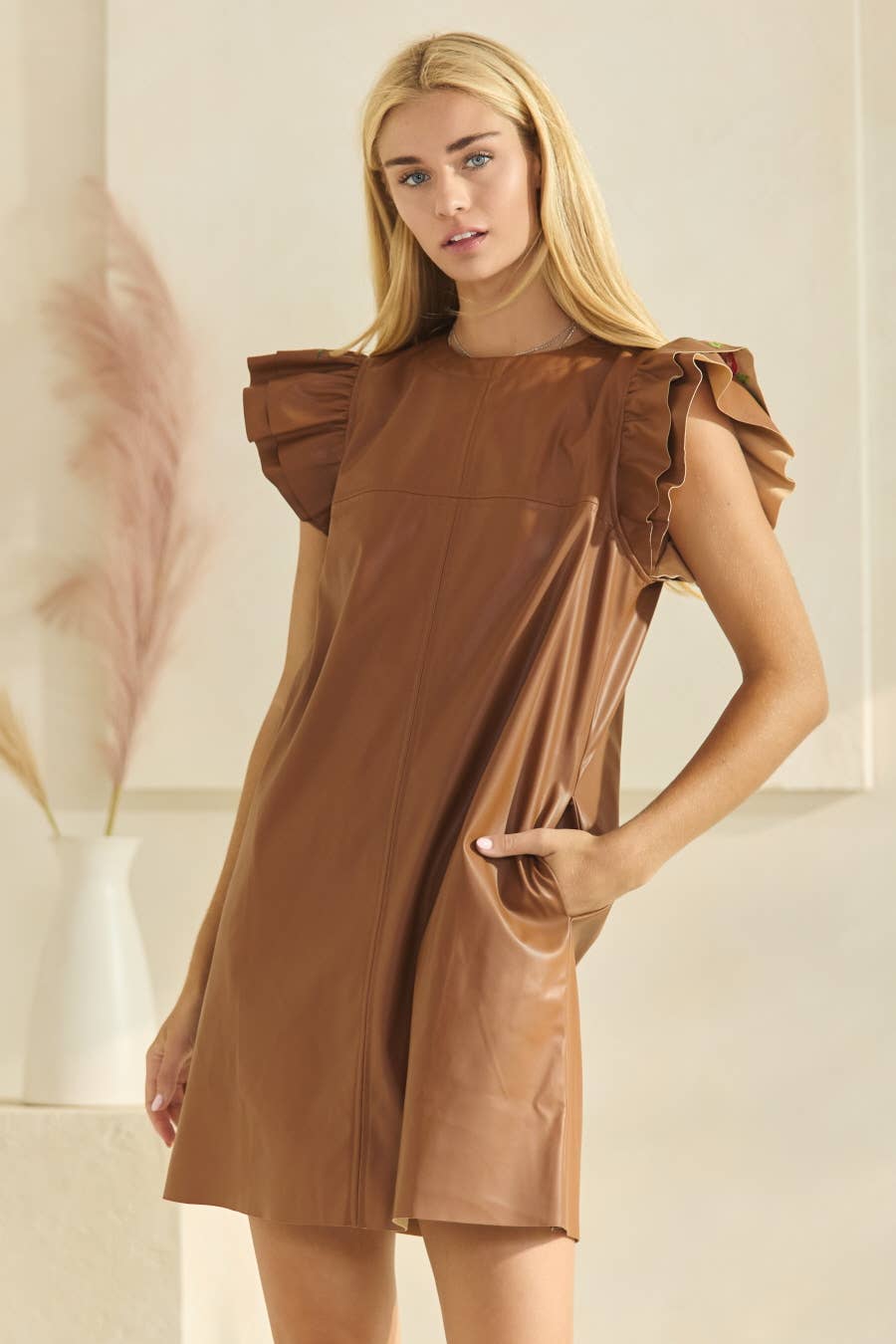 PU leather shift mini dress with embroidered flutter sleeve with back open zipper. Also available in sizes 1XL to 3XL: Style no. ID17115P. , Total Length: 35 1/2", Self: 55% Polyester, 45% PU, Lining: 100% Polyester.