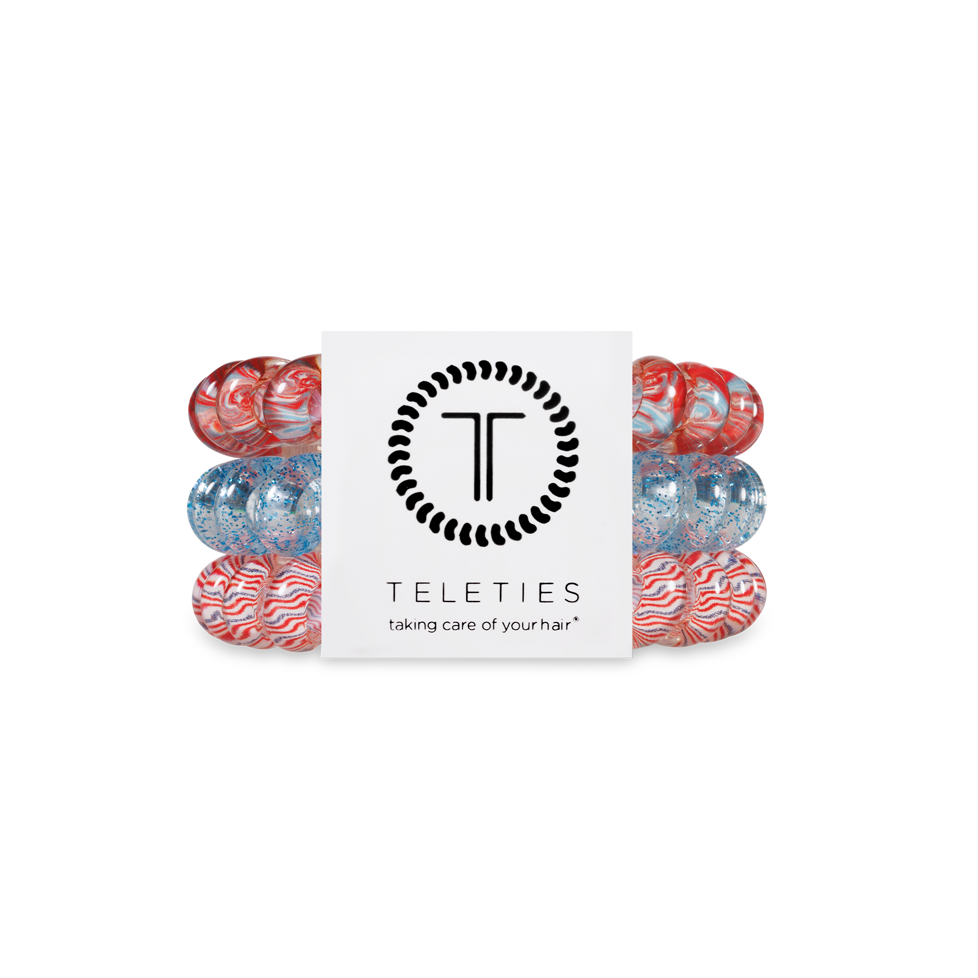 Hold your hair in place with ease and style! Freedom to Sparkle Large Hair Ties in red, white and blue offer a strong grip without damage, doubling as a stylish bracelet when not in use. Your new favorite hair essentials all year round.