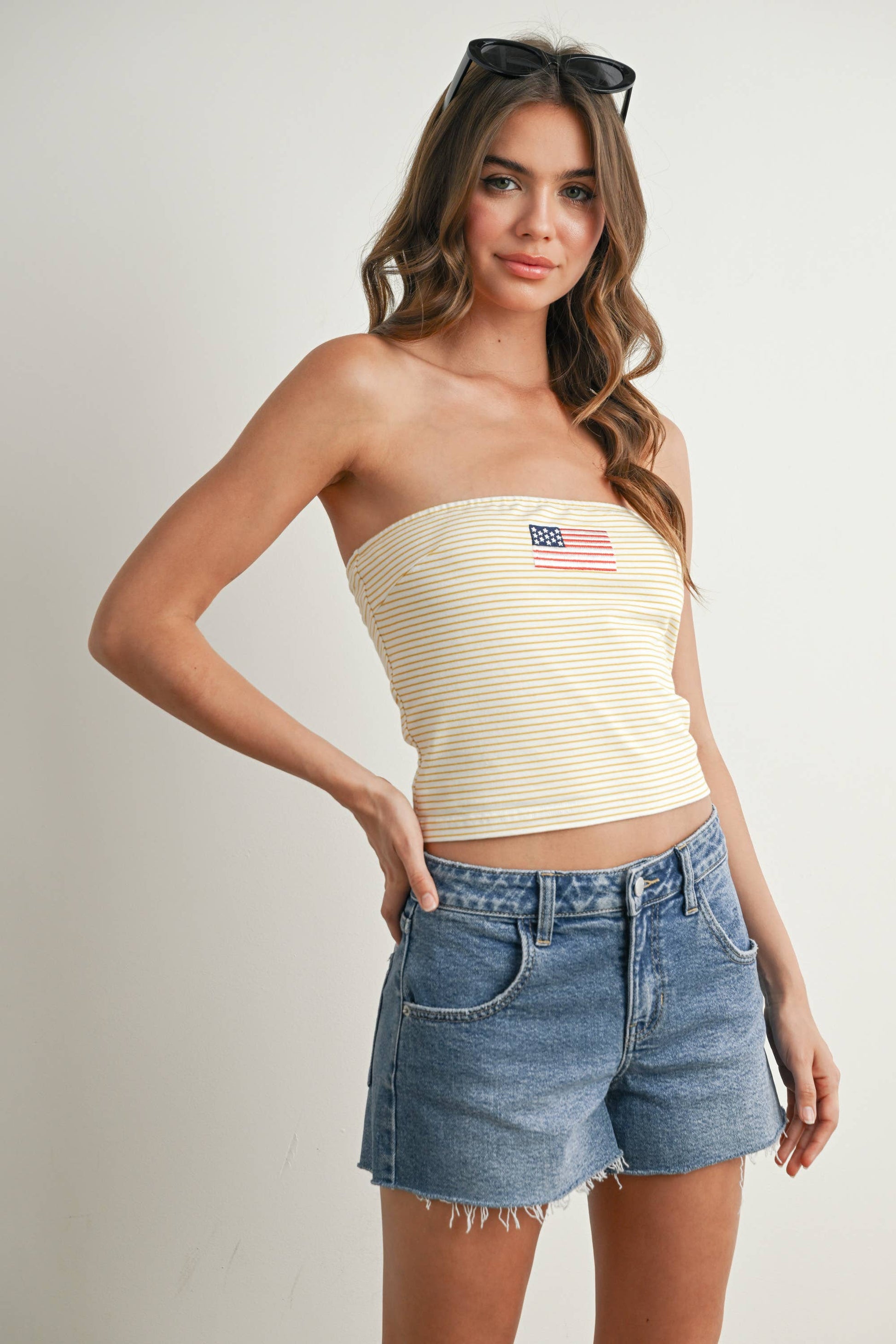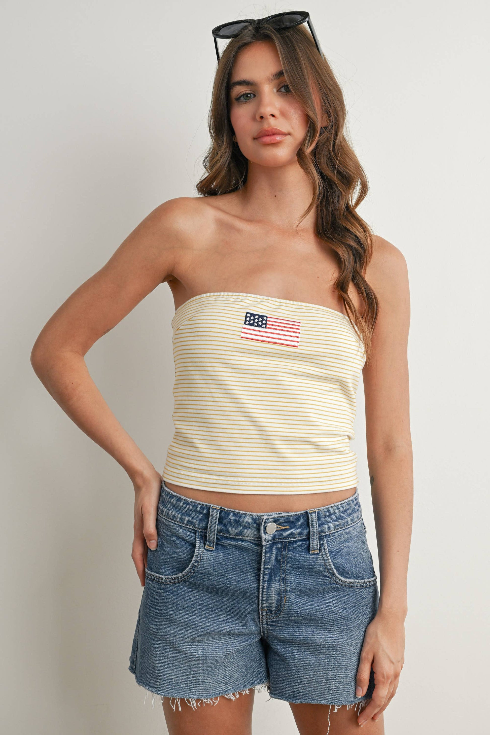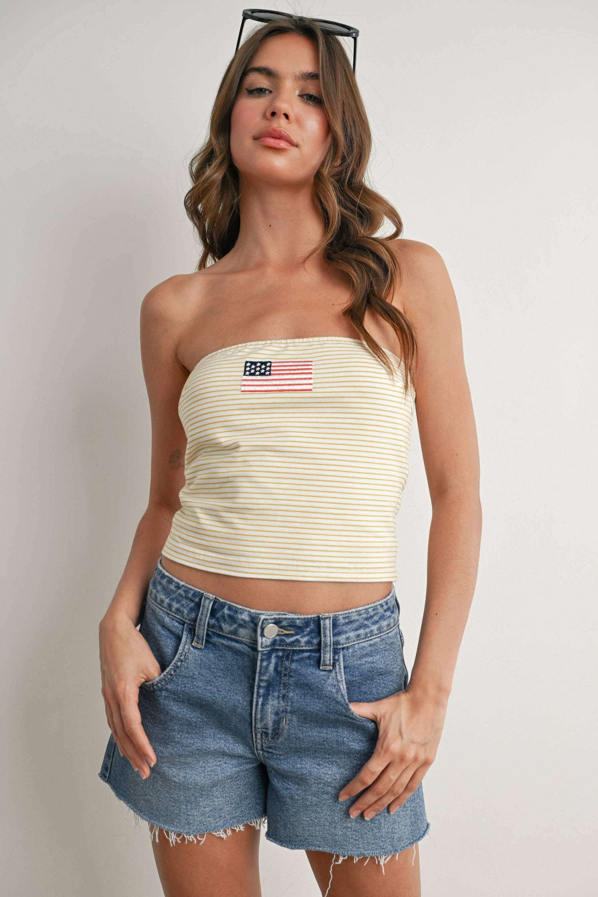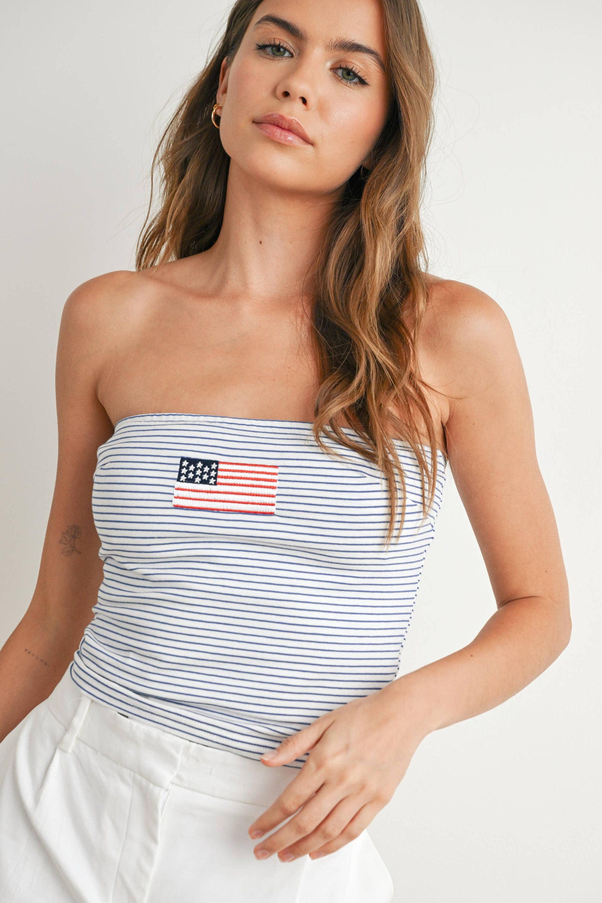 Show off your patriotic style with the Stars and Stripes Tube Top. Featuring classic navy stripes and a bold embroidered American flag detail, this strapless top combines comfort and style effortlessly. Its stretchy and breathable fabric ensures a snug fit, making it ideal for casual outings, summer barbecues, or festive occasions. Pair the Stars and Stripes Tube Top with white shorts or denim for a fresh, all-American look.