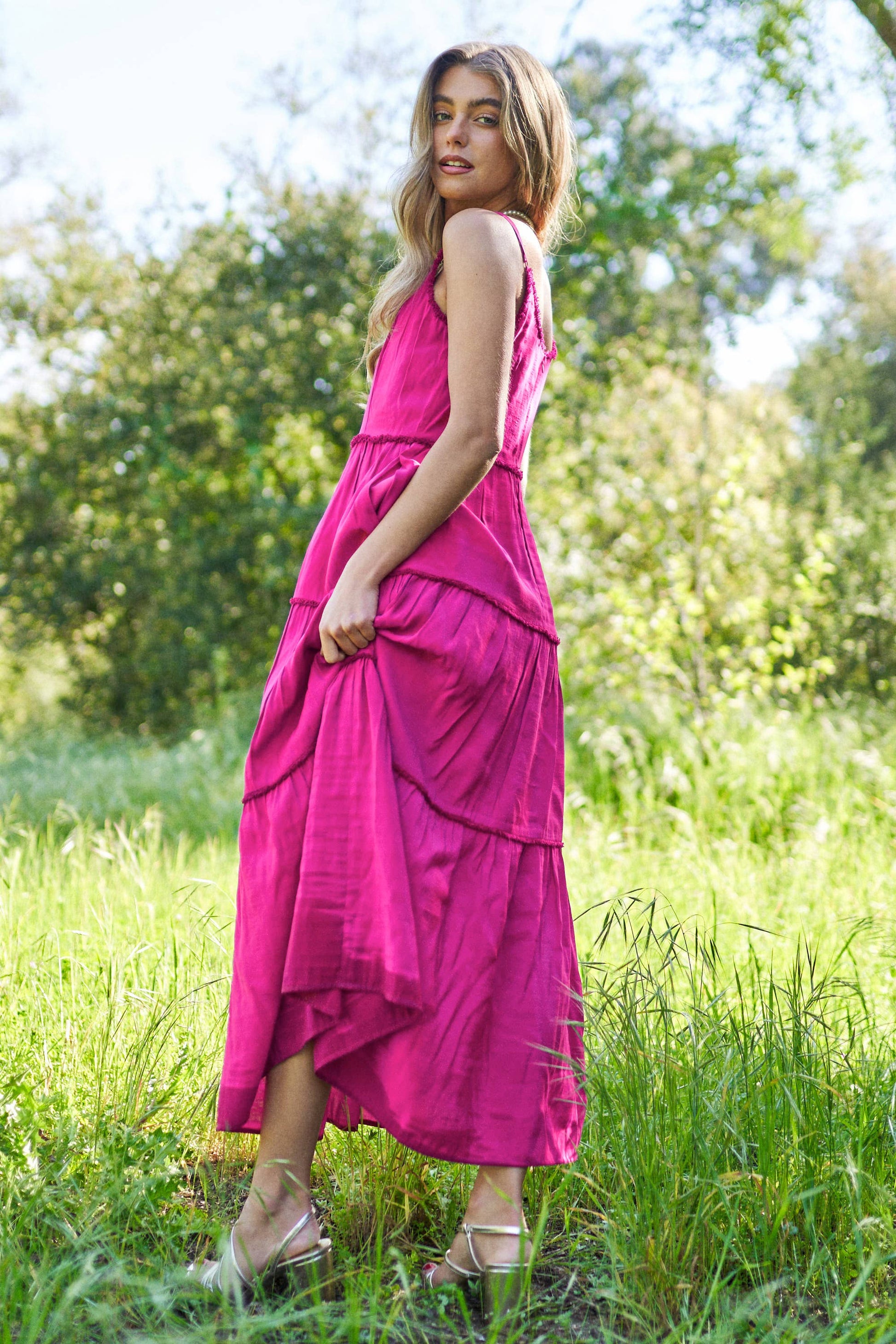 Women's tiered distressed hem maxi dress. Designed with adjustable straps.
